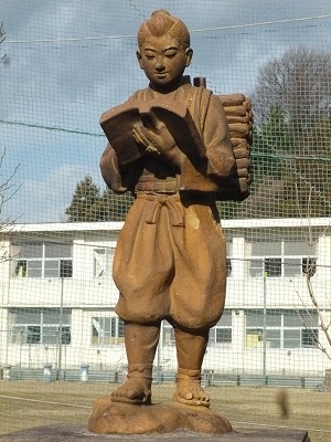 梅の花は満開 陶器製の二宮尊徳 校舎