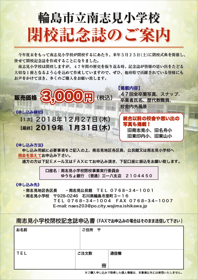 今年度末をもって南志見小学校が閉校し、長い歴史に幕を閉じることとなりました。来年3月23日(土)に閉校式典を開催し、併せて閉校記念誌を作成することになりました。48年間の歴史を振り返る時、記念誌が皆様の思い出をたどる大切な1冊となるよう心を込めて作成しております。