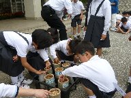 全校児童で,竹ポットにクヌギとコナラの種を植えました。