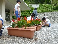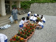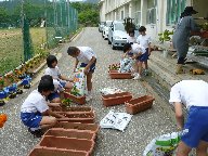 竹ポットに続いて,5・6年生はプランターに花植えを行いました。