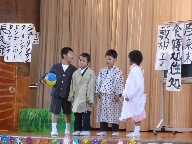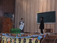 「じゅげむのお話は有名ですね。みなさん知っていますか?今日は,1・2年生6人で, じゅげむのお話を表現したいと思います。「大きな声で,しっかり台詞を言おう」と頑張ってきました。大道具もみんなで力を合わせてつくりました。それでは,どうぞお楽しみください。」