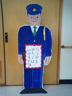 11月20日のなじみ表現会で2年生の出し物でがんばった「おまわりさん」が第2の人生を歩んでいます。2年教室の前で「ろうかをスピードを出して,走る子がいないかを見ています。」