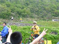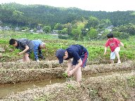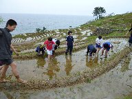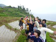 雨のため一日のびましたが,今年も千枚田愛耕会の方たちに指導していただき,田植えを行いました。その時に,陽気なカナダ人のツーリングおじさんが現れて一緒に写真をとりました。