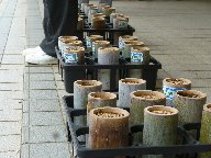 全校児童で,竹ポットにクヌギとコナラの種を植えました。