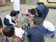 童に,堆肥の中にカブトムシの幼虫がいることを知らせると,早速掘り出して,虫かごに入れていました。