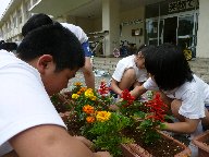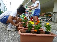 竹ポットに続いて,5・6年生はプランターに花植えを行いました。