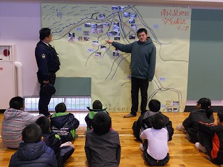 南志見駐在所のおまわりさんとPTA会長が,危ない箇所の説明をしてくれました