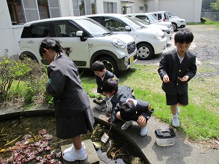 本校舎裏職員駐車場の池におたまじゃくしがたくさんいます。1年生は生活科の授業で観察することになりました。休み時間には、2年生も手伝いに来てくれました。教室で飼ってみんなで大事に育てていきたいですね。