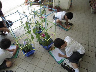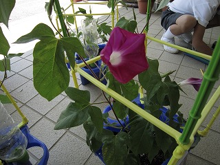 1年生が育てた朝顔が花を咲かせました。1年生は毎日毎日丁寧にに朝顔に水やりをしています。みんなが一生懸命に手入れをしたので紫や青の色とりどりの朝顔の花が玄関を飾ってくれました。もっともっとたくさんのお花を咲かせようね。