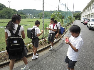 2学期始業式前にウォーミングアップ登校がありました。久しぶりに元気な子どもたちの声が学校に響き渡りました。夏休み中に一生懸命作った貯金箱や自由研究がとても素敵です。下校時には学校で育てたスイカをみんなで食べました。