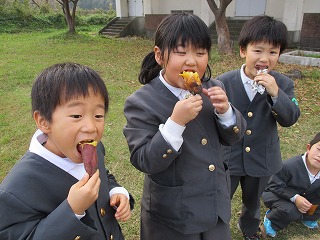 1.2年生の生活科の授業で育てたさつまいもで焼き芋を作りました。落ち葉やもみ殻を燃やして本格的な焼き芋を食べました。とにかくおいしい!こんなに贅沢な料理を食べれる子どもたちは本当に幸せですね。よかったね。