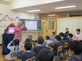 紙芝居で有名な野間成之さんが本校にお越しくださいました。南志見保育所さんの年長さんも一緒に参加しました。野間さんの話術によって、子どもたちもぐいぐいと紙芝居の世界に引き込まれていきました。最後には、みんながノリノリでとても笑顔いっぱいで喜んでいました。