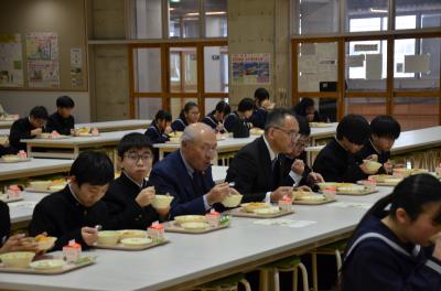 一覧へ 1. 黒川シェフ(七尾市)監修の「ブロフ野菜ポトフ」給食 投稿日時: 2023/12/26 nakanoj 約1400食を調理中 【今回はコンソメなどを使用せず調理し,おいしい野菜などの素材の出汁を味わうことができました。】 黒川シェフ(写真中央)からのビデオメッセージをランチルームで食事とともにに視聴しました。 また,長屋農園の長屋さん(写真右下)も来校し,給食を一緒にいただきました。