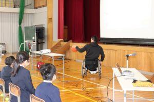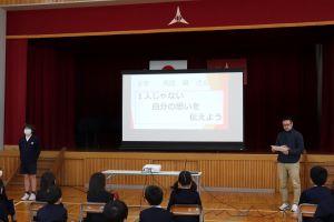 5年生は、道徳の時間に川北中学校ALTのジョシュアウィリアムズ先生をお迎えし、ふるさとのカリフォルニアについて教えてもらいました。