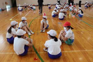 3校児童が混ざったグループをつくり、グループ内で自己紹介と器械運動の感想を交流しました。
