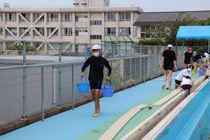バケツで水を運んでいます。ワッセ、ワッセ・・