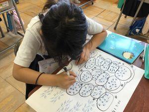 自分のプリントを見せながら、数え方のくふうが分かるように、説明しています。花丸