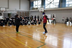聞こえるように声を出したり、コーンをたたいて音を出したり、また、ける方向を指でしめしてもらい指示を与えるなどして、まっすぐけることができるようにしました。