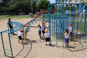 鉄棒の支柱や、ブランコの座る所が赤なので、触っています。