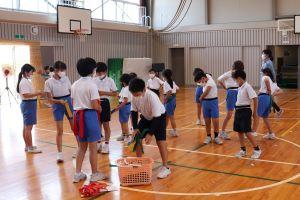 高学年が低学年に、尻尾(タグ)をつけてあげています。