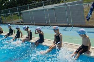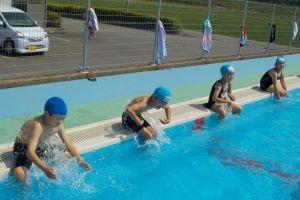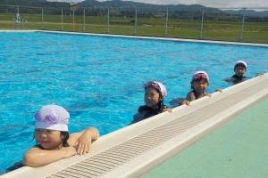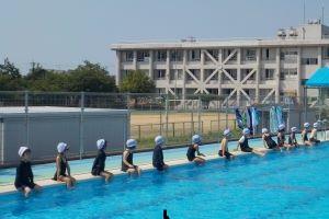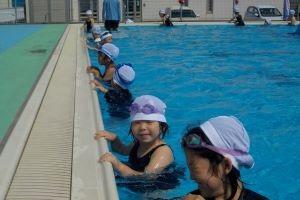 昨日、1年生は、2年生と一緒に初めてのプールに入りました。