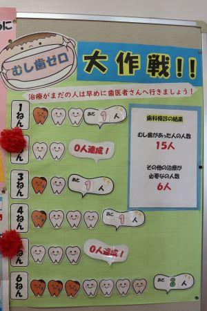 「むし歯ゼロ大作戦!!」保健室前のむし歯治療の掲示です。