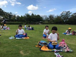コロナ感染対策のため、お友達との距離を1m以上あけていますが、みんな笑顔いっぱいで、食べています。
