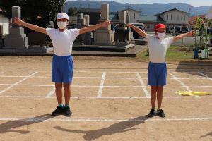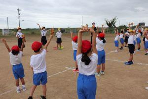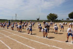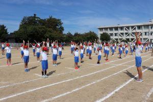 石拾いが終わったあとで、体育委員が準備運動の練習をしています。