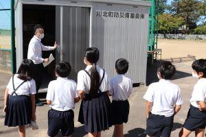町の防災備蓄倉庫が、体育館のそばにあります。
