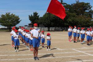 「駆け足~」の合図で、それぞれの旗の所に集まります。