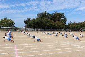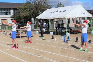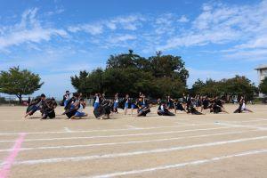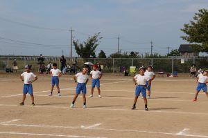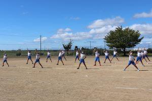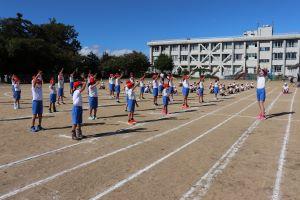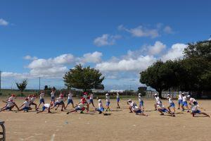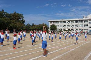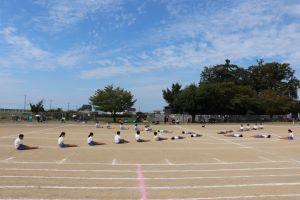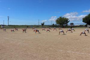 石拾いが終わったあとで、体育委員が準備運動の練習をしています。