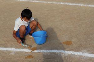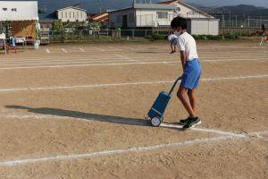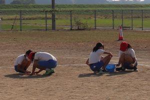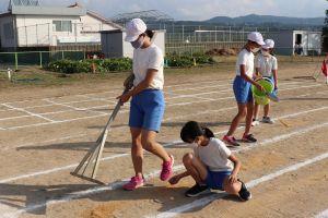 5.6年生の団体演技では、裸足になるため、小石を取り除きます。
