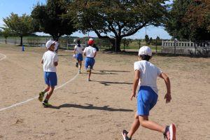 走っているときに密にならないように、運動場に3重の線が引いてあり、外側を高学年、真ん中を中学年、内側を低学年が走ります。