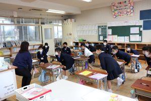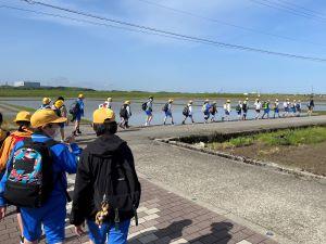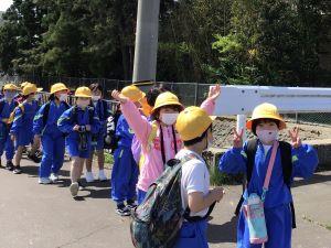 小学校生活で初めての避難訓練ですが、おしゃべりせず、落ち着いて行動しています。花丸