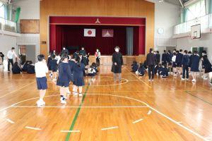 給食室から出火したとの想定で、体育館に避難しました。
