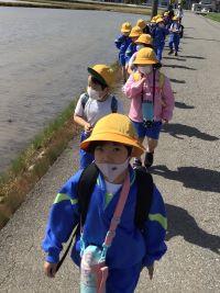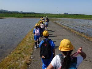 田んぼ道を1列で歩いていきます。