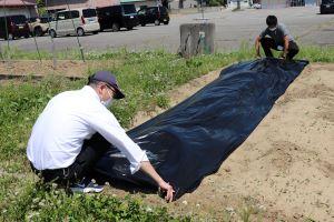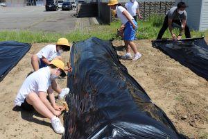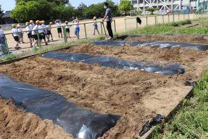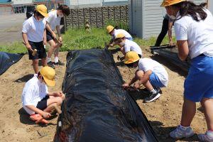 4月に6年生が、畑の畝づくりをしたので、次は、3年、4年生がマルチがけ。
