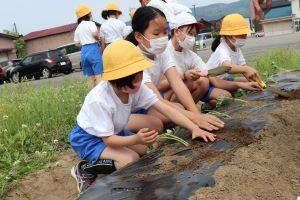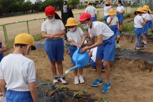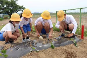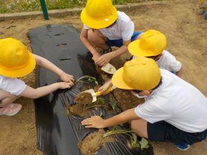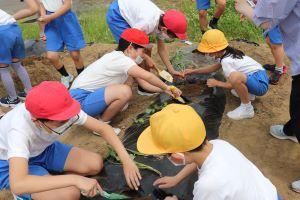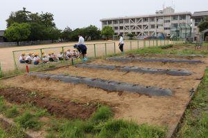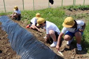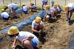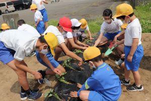 18日(水)に、3,4年生の縦割りチームで畑の畝のマルチかけをしたので、昨日、今日で、さつまいもの苗植えをしました。