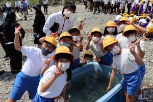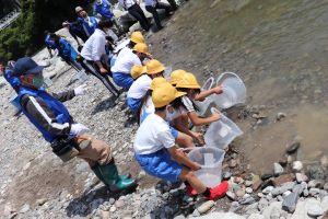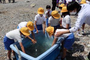 これは、学童鮎放流自然観察体験学習事業の一環として、鮎の放流を行うことで、子どもたちに河川環境の重要性を知ってもらい、手取川の鮎復活と増殖、保護育成の為に重要な事業だそうです。