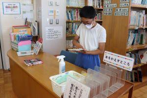 入り口のカウンターでは、今日の図書当番の図書委員長が、本の消毒をしていました。