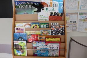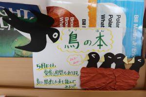 玄関前の本棚には、今月は「鳥」に関係する本が並べられています。