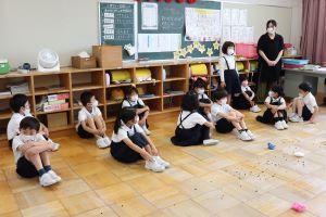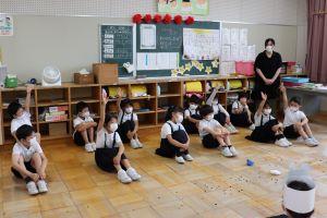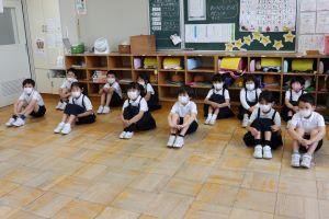 2年生が教室に戻ったあと、1年生のふり返りをしています。