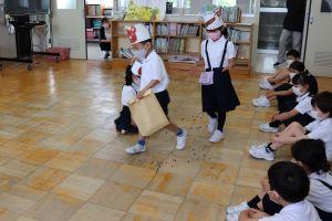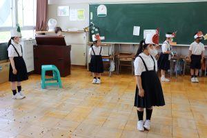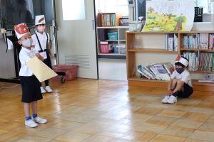 これは、「1年生を迎える会」で2年生が発表した音読劇に感動した1年生が、今度は、自分たちも劇をして、2年生に発表したい!という思いから、実現しました。