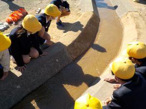 手取川を模した延長30mのミニ水路を使った実演を見ます。