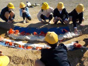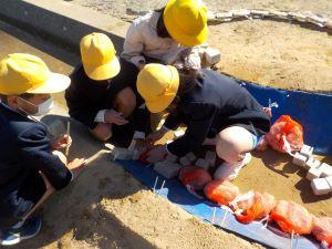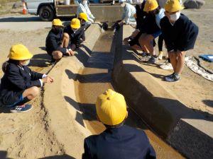 実際に、ブロックやシートなどの道具を使って、堤防の補強をしています。