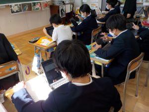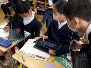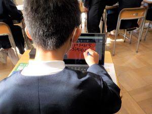 クロムブックに映し出された友達の考えに、自分の考えを付け足しています。