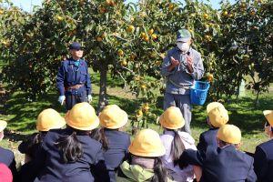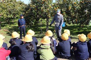3年生の総合的な学習の時間、「川北町大好き!~中島のよさを紹介しよう~」の一環として、川北町の特産品の一つである柿の収穫を体験させていただきました。