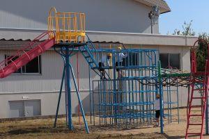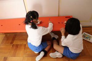 保健室の前に置いてあるベンチの穴を使って、おはじき遊びをしている2年生。
