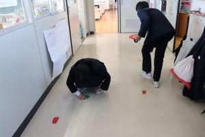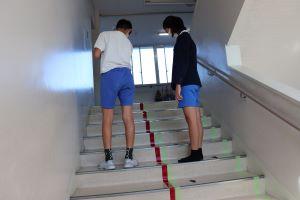 階段では、カラーテープを貼ったあと、1段飛ばししないようにするためには、どうすればよいのか、相談中・・