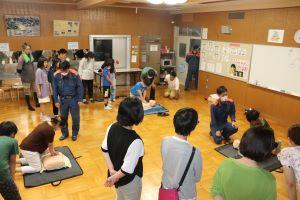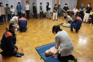 これがなかなか難しく、圧迫する場所がずれたり、しっかり圧迫できなかったり、途中で、圧迫が弱くなったりしました。くり返すことで子ども達もリズムよく、力を入れてできるようになりました。